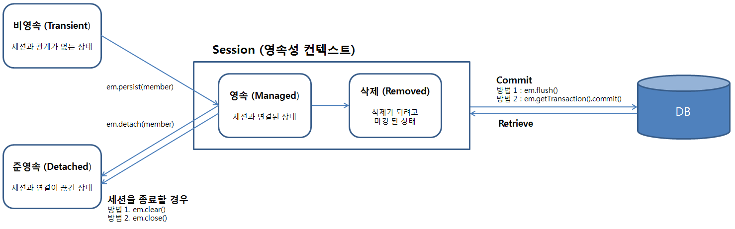 즉 EntityManager 의 역할은 세션, Transaction 의 관리다.